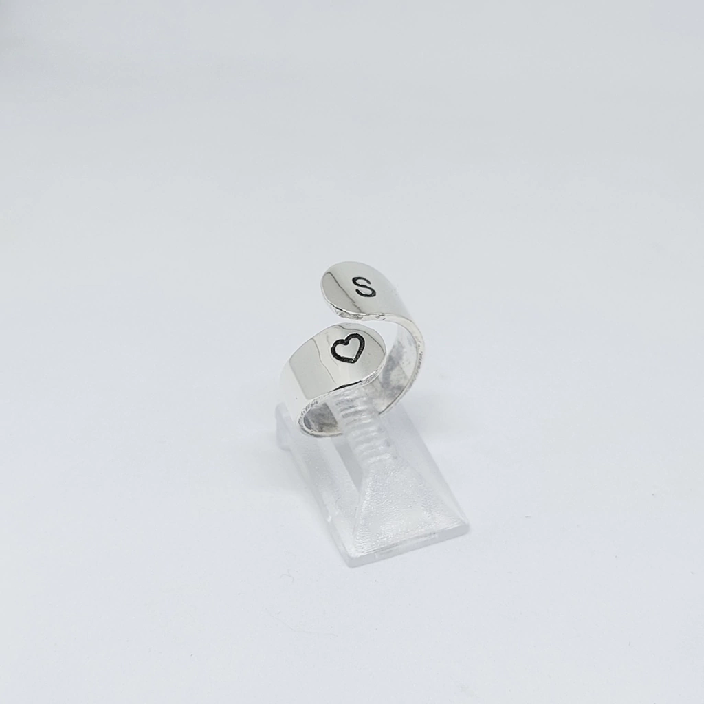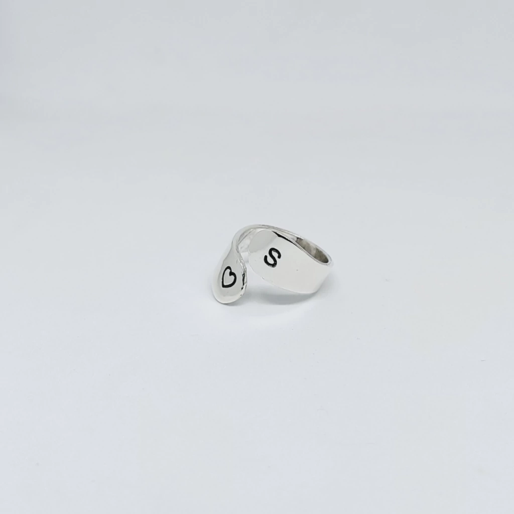 Anillo abierto tipo pellizco, con grabado personalizado. Podés elegir iniciales, símbolos o una combinación que tenga sentido para vos.