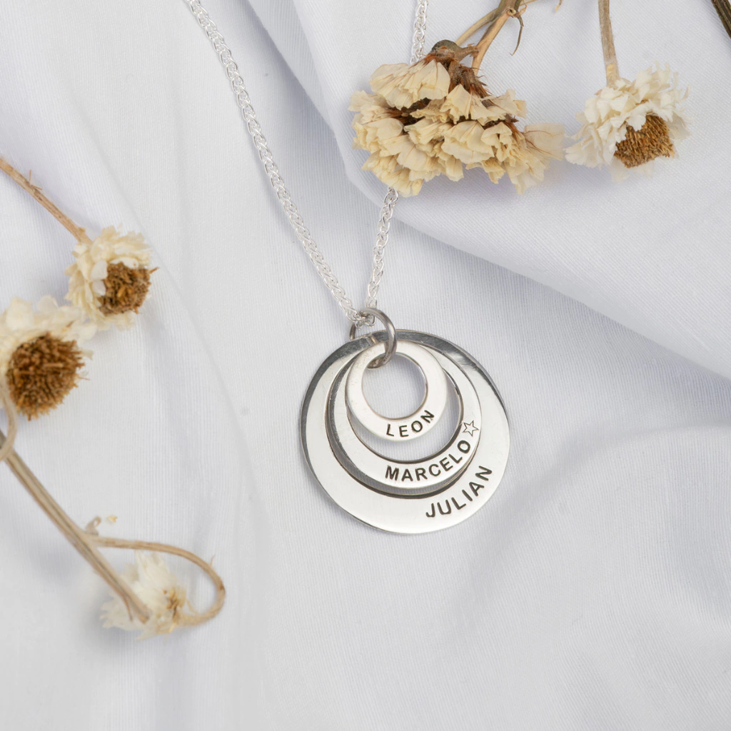 Tres medallas de distinto tamaño, grabadas una a una con los nombres que elijas. Un diseño lleno de significado, hecho artesanalmente para vos o para regalar.