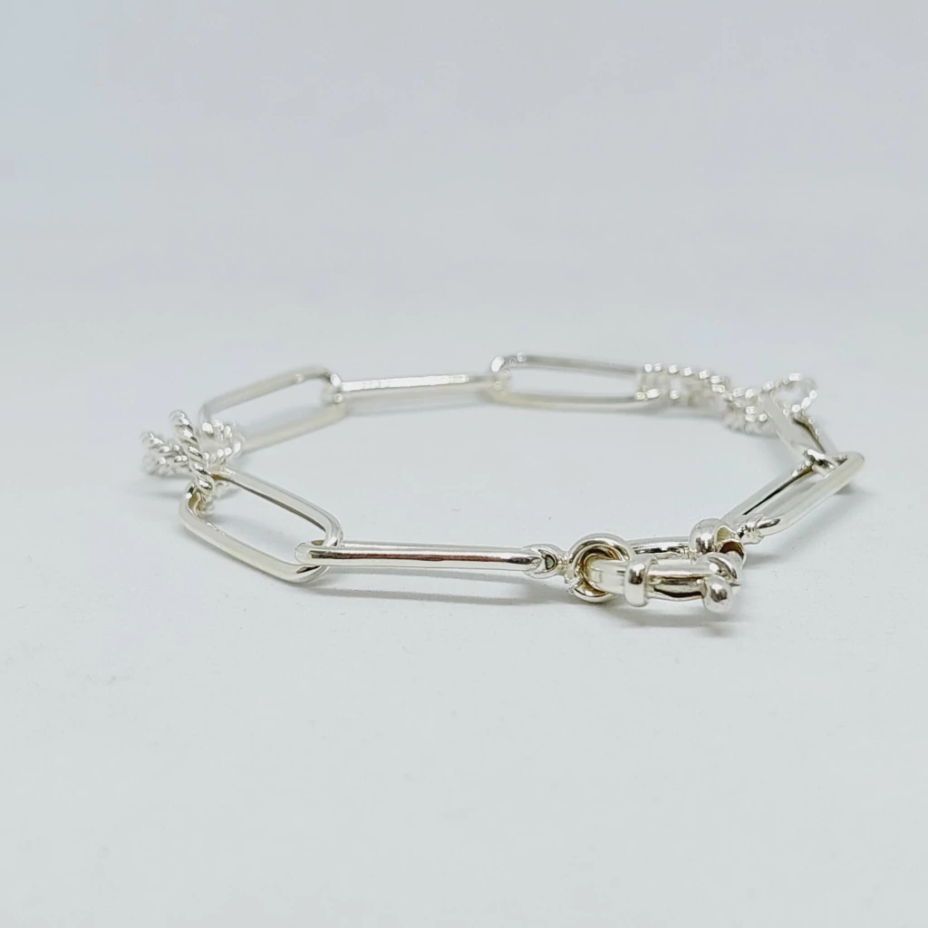Un diseño original que fusiona distintos eslabones en una pieza única y elegante. El cierre marinero le aporta practicidad y un toque distintivo, perfecta para lucir sola o acompañar otras pulseras.