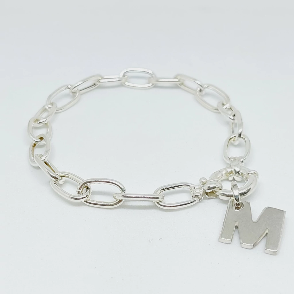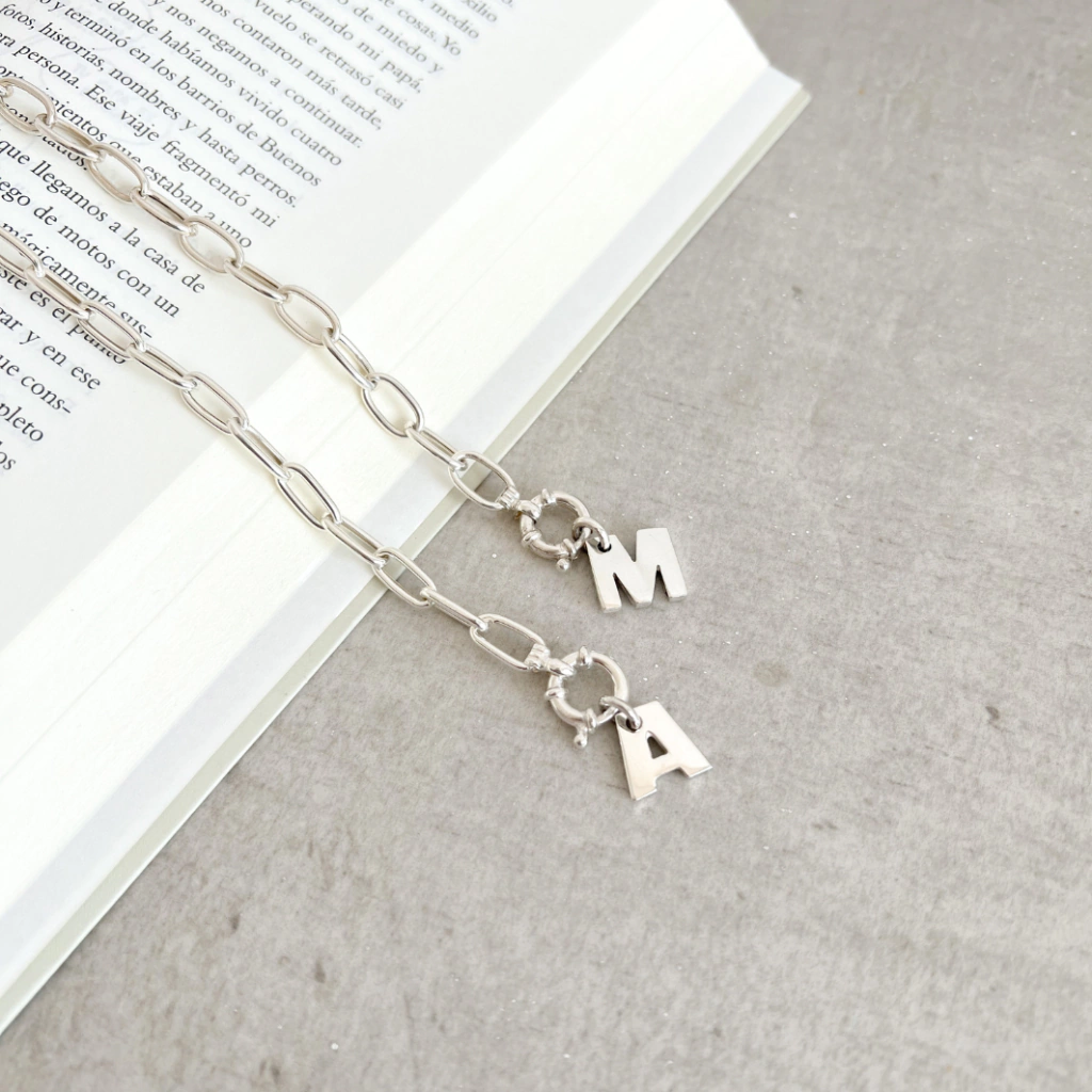 Una pulsera de eslabones, con diseño moderno y personalidad. El dije con inicial le suma un toque único, ideal para regalar o usar todos los días como firma personal.