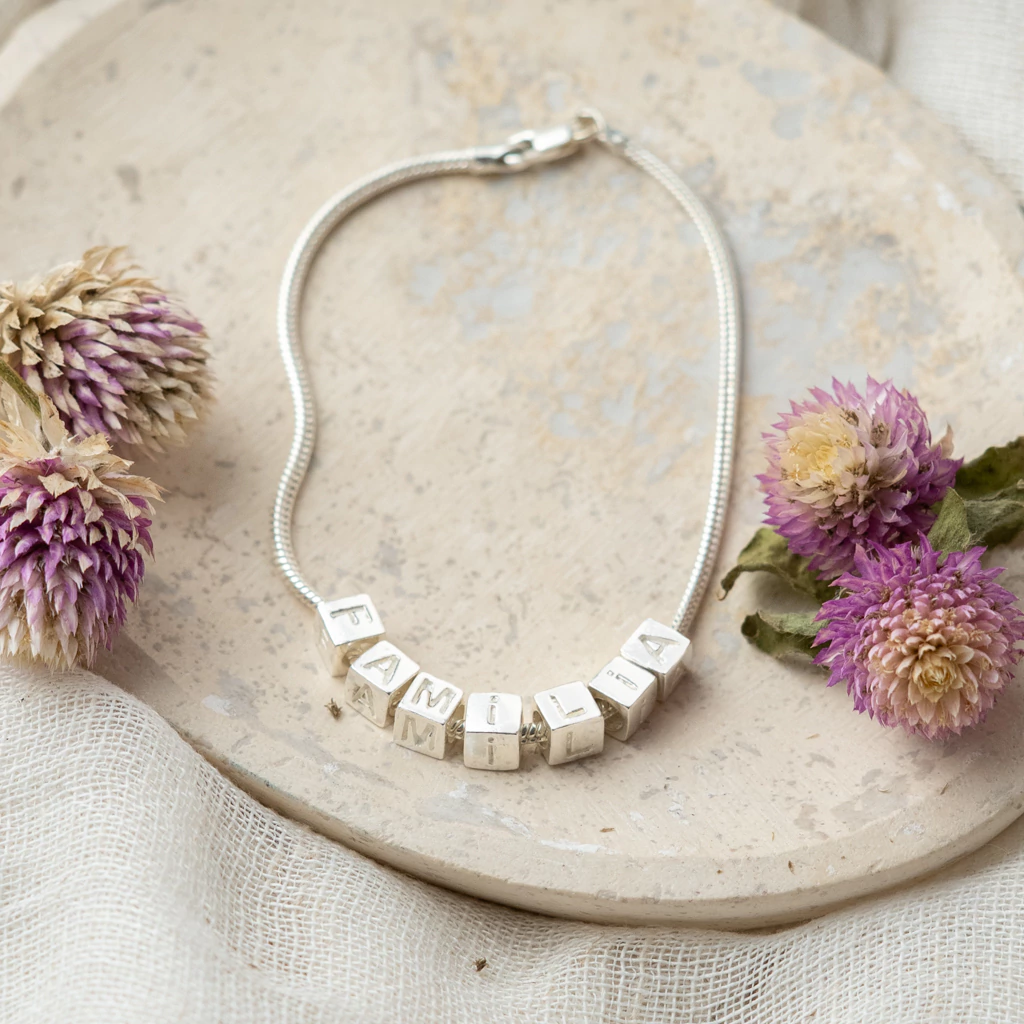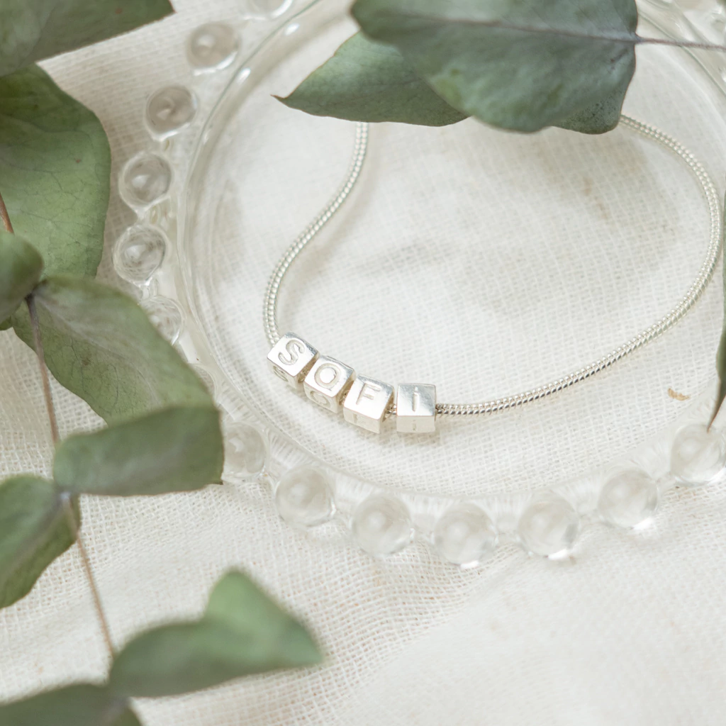 Diseñala a tu manera, combinando cubos de plata con iniciales para armar nombres, palabras o frases que signifiquen algo especial para vos.